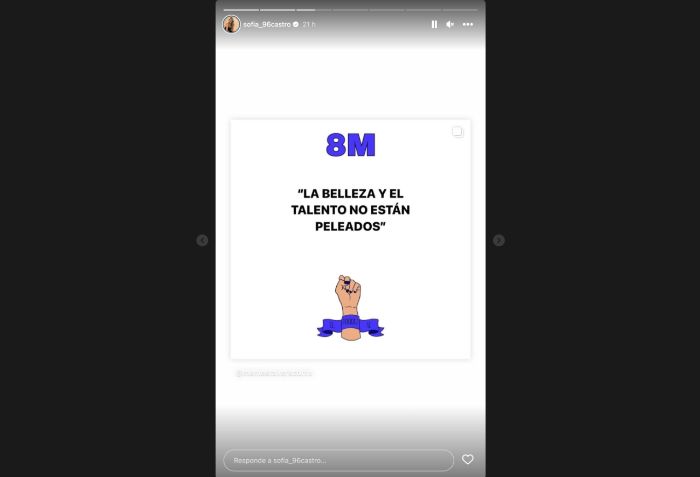 En el marco de la fecha que conmemora a las mujeres que dieron su vida luchando por sus derechos y por la igualdad laboral, Sofía Castro publicó en sus stories: “La belleza y el talento no están peleados”.