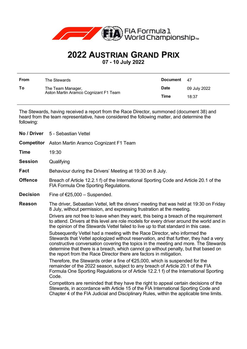 “Los pilotos no son libres de marcharse cuando quieran, ya que esto supone un incumplimiento de la obligación de asistir. A este nivel son un ejemplo para todos los pilotos del mundo y, en opinión de los comisarios, Vettel no estuvo a la altura en este caso”, añadió.