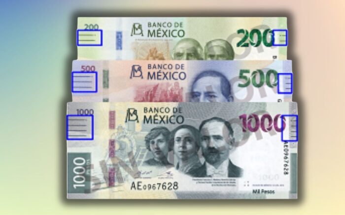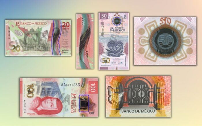 En la más reciente familia de billetes, conocida como familia G, que se introdujo gradualmente entre 2018 y 2021 y también incluye nuevas marcas hápticas en las denominaciones de 200, 500 y 1,000 pesos.