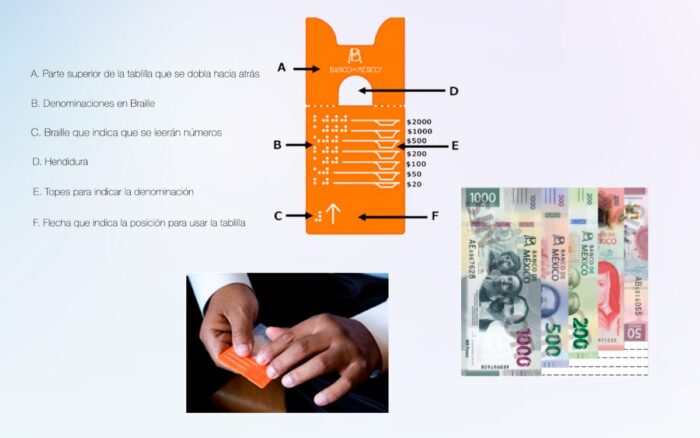Además, esta nueva familia de billetes también se diseñó con variaciones de longitud entre las denominaciones para facilitar aún más su identificación. Por lo anterior, el Banco de México diseñó una tablilla para identificar la denominación de los billetes de las familias F y G. La distribución de esta tablilla inició con la puesta en circulación del billete de 200 pesos, es decir, en septiembre de 2019.