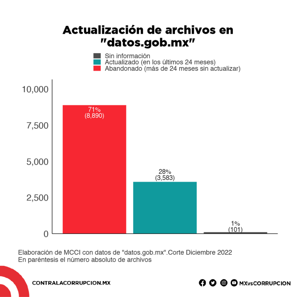 Para muestra, un botón: de las 12,570 bases de datos con información del gobierno que están disponibles en la plataforma de datos.gob.mx, actualmente el 71% se encuentran abandonadas, sin ninguna actualización al menos en los últimos 24 meses. En lugar de la existencia de otros datos, la apuesta pública parece tener cada vez menos datos.