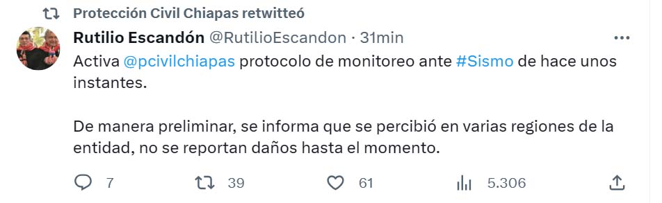 El gobernador de Chiapas, Rutilio Escandón, informó que Protección Civil de la entidad activó de inmediato el protocolo de monitoreo del sismo y señaló de manera preliminar que se percibió en varias regiones de la entidad, pero que no se reportan daños hasta el momento.