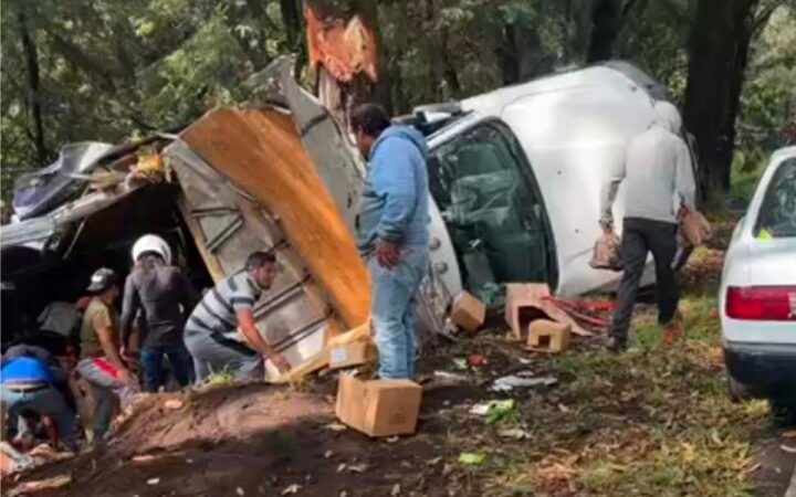 Una camioneta con más de 3 toneladas de víveres donados para los afectados por el paso del huracán Otis de Acapulco, Guerrero, volcó la mañana de este jueves en Huitzilac, Morelos.