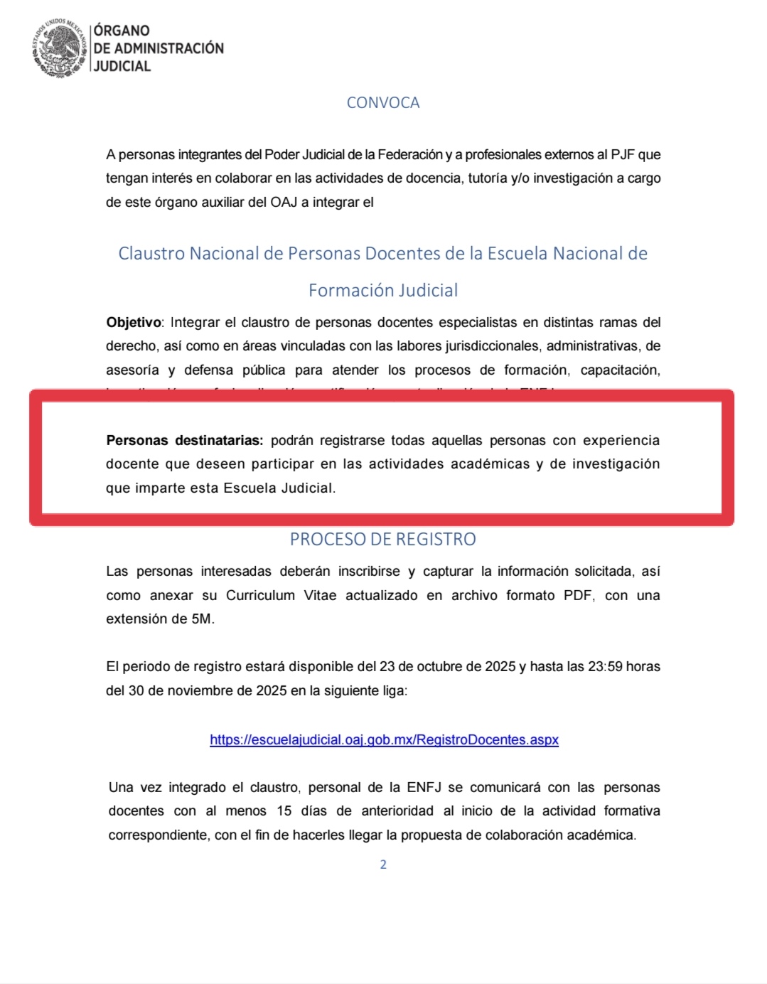 La Escuela Nacional de Formación Judicial (ENFJ), encargada de capacitar al personal del Poder Judicial de la Federación, lanzó una convocatoria para integrar a su claustro docente sin exigir que las personas aspirantes hayan ejercido funciones jurisdiccionales.