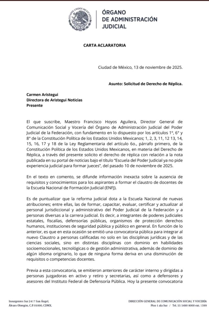 El que suscribe, Maestro Francisco Hoyos Aguilera, Director General de Comunicación Social y Vocería del Órgano de Administración Judicial del Poder Judicial de la Federación, con fundamento en lo dispuesto por los artículos 1º, 6° y 8° de la Constitución Política de los Estados Unidos Mexicanos; 1, 2, 3, 11, 12 13, 14, 15, 16, 17 y 18 de la Ley Reglamentaria del artículo 6o., párrafo primero, de la Constitución Política de los Estados Unidos Mexicanos, en materia del Derecho de Réplica, a través del presente solicito el derecho de réplica con relación a la nota publicada en su portal de noticias bajo el título “Escuela del Poder Judicial ya no pide experiencia judicial para formar jueces”, del pasado 10 de noviembre de 2025.