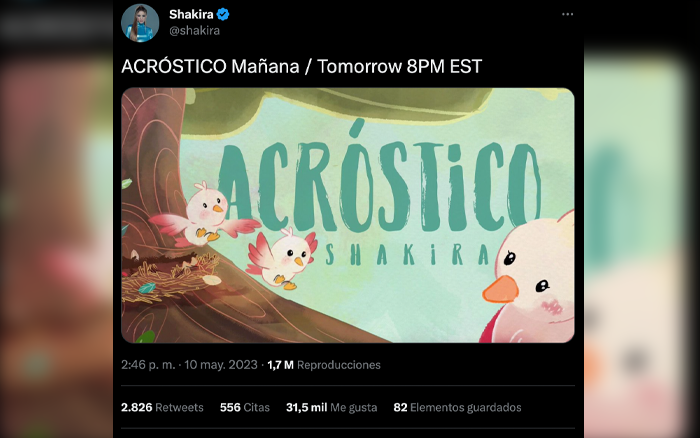 Con la sencilla frase “ACRÓSTICO Mañana/Tomorrow 8PM EST”, la cantante colombiana anunciaba su nuevo tema acompañada de una foto de portada que da pistas del tema principal de la canción: dos pájaros dejando el nido ante la atenta mirada de mamá pájaro que cuida sus primeros pasos fuera de casa.