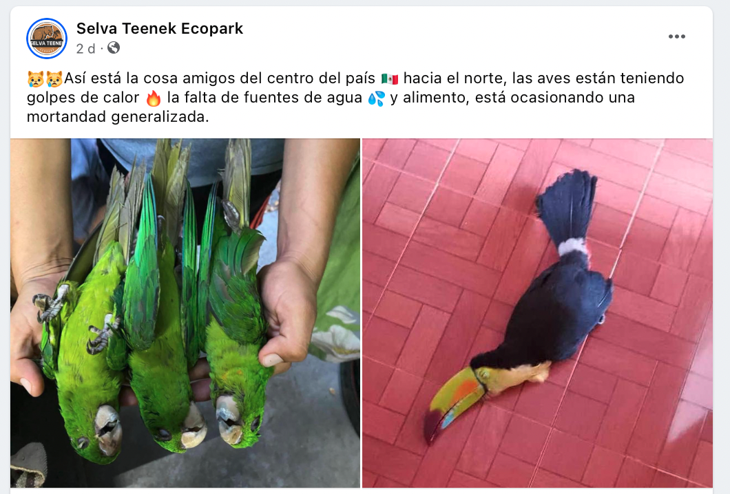 Desde pericos, tucanes, tordos y tecolotes fallecieron debido a la falta de agua, comida y el calor extremo registrado, indicó la organización ambiental Selva Teenek Ecopark.