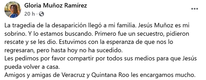 A través de su redes sociales, la columnista de La Jornada y directora del portal de noticias Desinformémonos relató: “La tragedia de la desaparición llegó a mi familia. Jesús Muñoz es mi sobrino. Y lo estamos buscando. Primero fue un secuestro, pidieron dinero y se les dio. Estuvimos con la esperanza de que nos lo regresaran, pero hasta hoy no sucedió”.