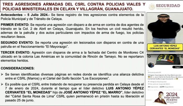 Ante esto que fue denunciados por el mandatario, informó que en las posibles hipótesis detrás de estos hechos de violencia, se maneja la puesta en libertad de Luis Antonio Yépez Cervantes “El Monedas”, hijo de José Antonio Yépez “El Marro”, líder delictivo del Cartel de Santa Rosa de Lima (CSRL).