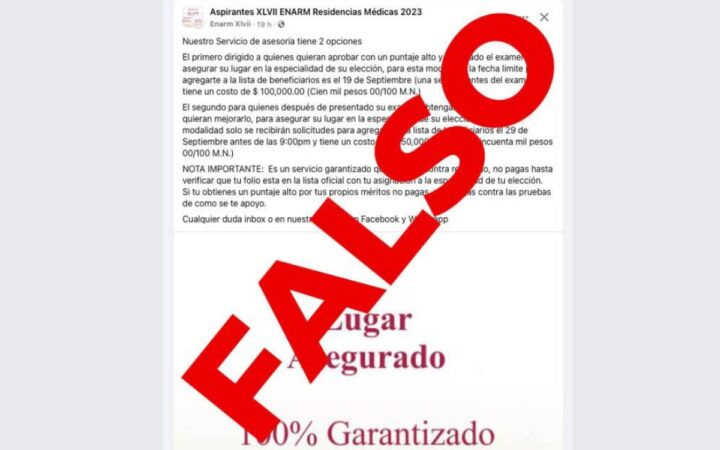 La Secretaría de Salud, a través de la Dirección General de Calidad y Educación en Salud (DGCES), emitieron una alerta sobre supuestas ofertas engañosas que circulan en redes sociales, donde se prometen plazas directas para residencias médicas con la promesa de estudiar una especialidad.