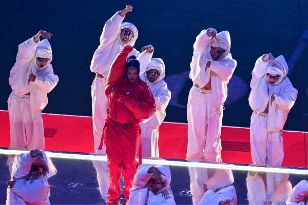 Vestida con un mono rojo, Rihanna cantó mientras la plataforma descendía gradualmente hasta el suelo del estadio de Glendale, Arizona. La rodeaban decenas de bailarines vestidos de blanco.