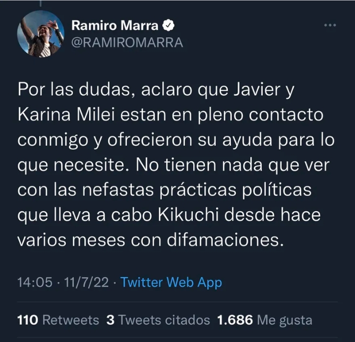 Los cruces de acusaciones se dan incluso entre las figuras principales del espacio. En julio de 2022, por ejemplo, Marra recurrió a Twitter para desmentir que estuviera internado en Estados Unidos. Debió aclarar que había viajado para acompañar a su padre, quien afrontaba serios problemas de salud. Pero no le apuntó al kirchnerismo o a Juntos por el Cambio por la propalación de esos rumores, sino a la interna libertaria.