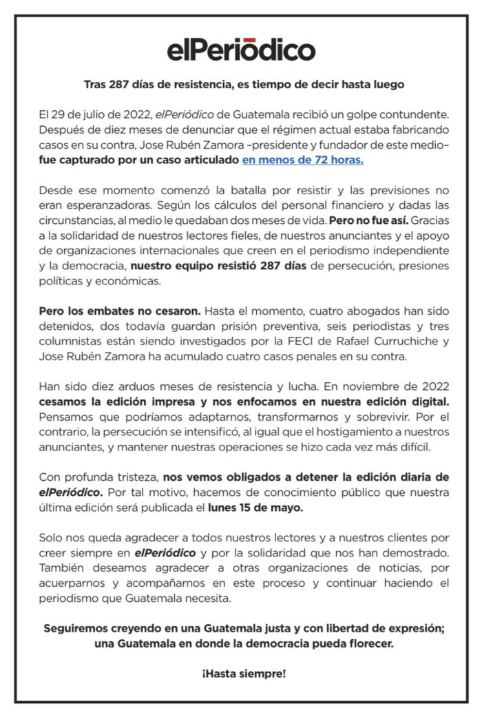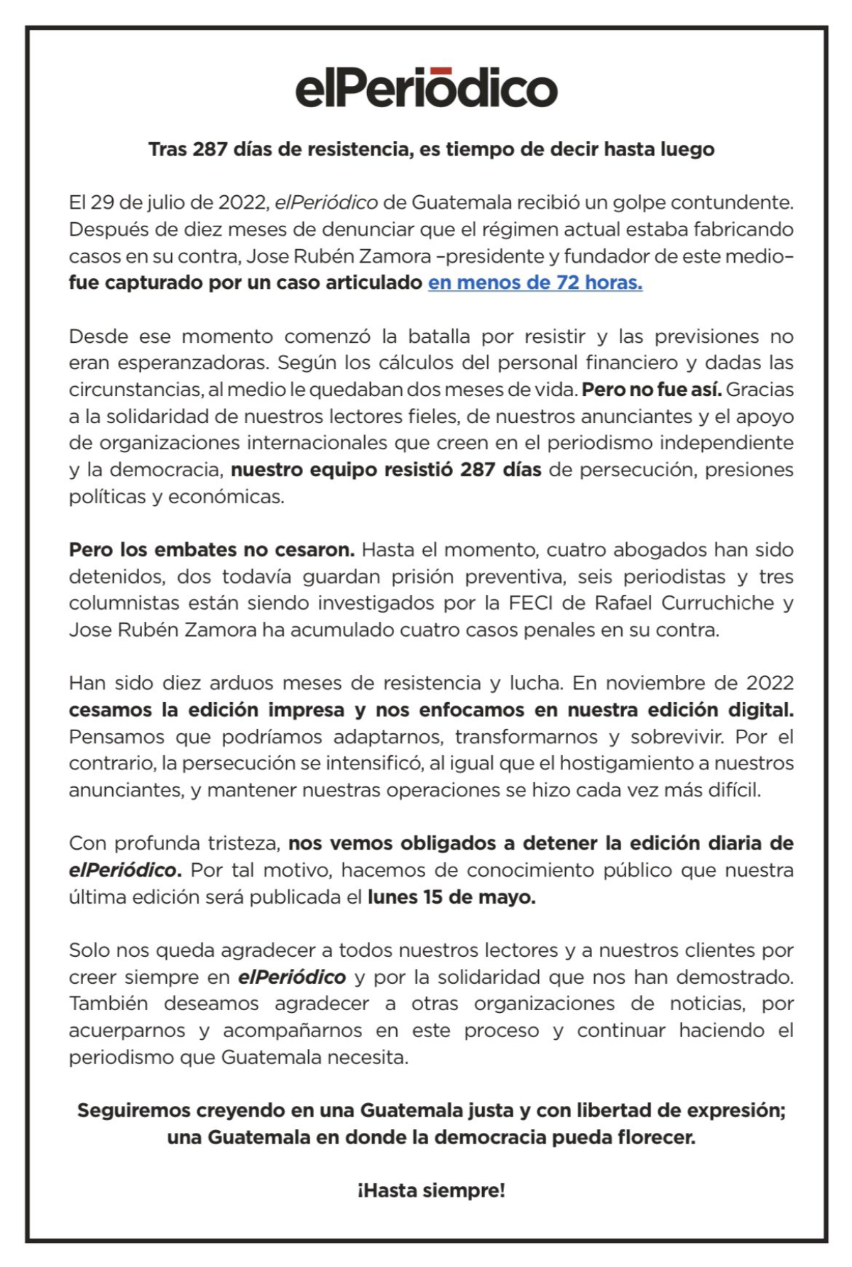Este viernes elPeriódico, uno de los medios independientes del país centroamericano, anunció el cierre de su edición diaria a partir del próximo lunes 15 de mayo. La publicación señala que el medio y su presidente, el periodista José Rubén Zamora, sufren persecución del régimen encabezado por el presidente Alejandro Giammattei.
