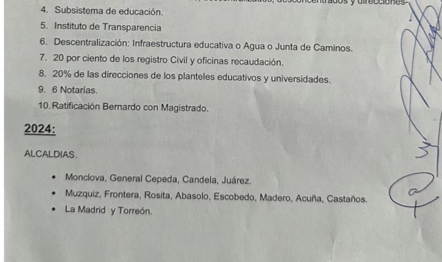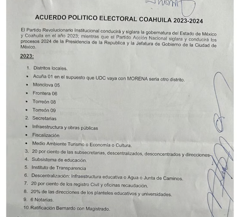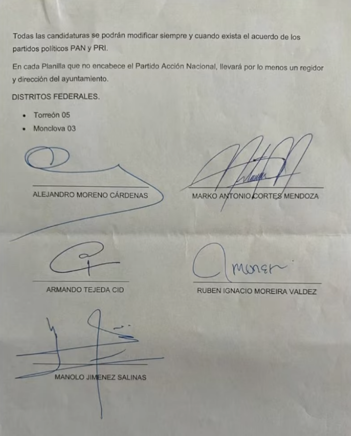 El documento, firmado también por Armando Tejeda Cid, ex operador de la campaña de Xóchitl Galvéz; Rubén Ignacio Moreira, coordinador de la bancada del PRI en la Cámara de Diputados, y Manolo Jiménez Salinas, gobernador del estado, establece una eventual repartición de candidaturas a nivel federal, gubernaturas, vacantes en órganos autónomos y hasta directivos de centros escolares.