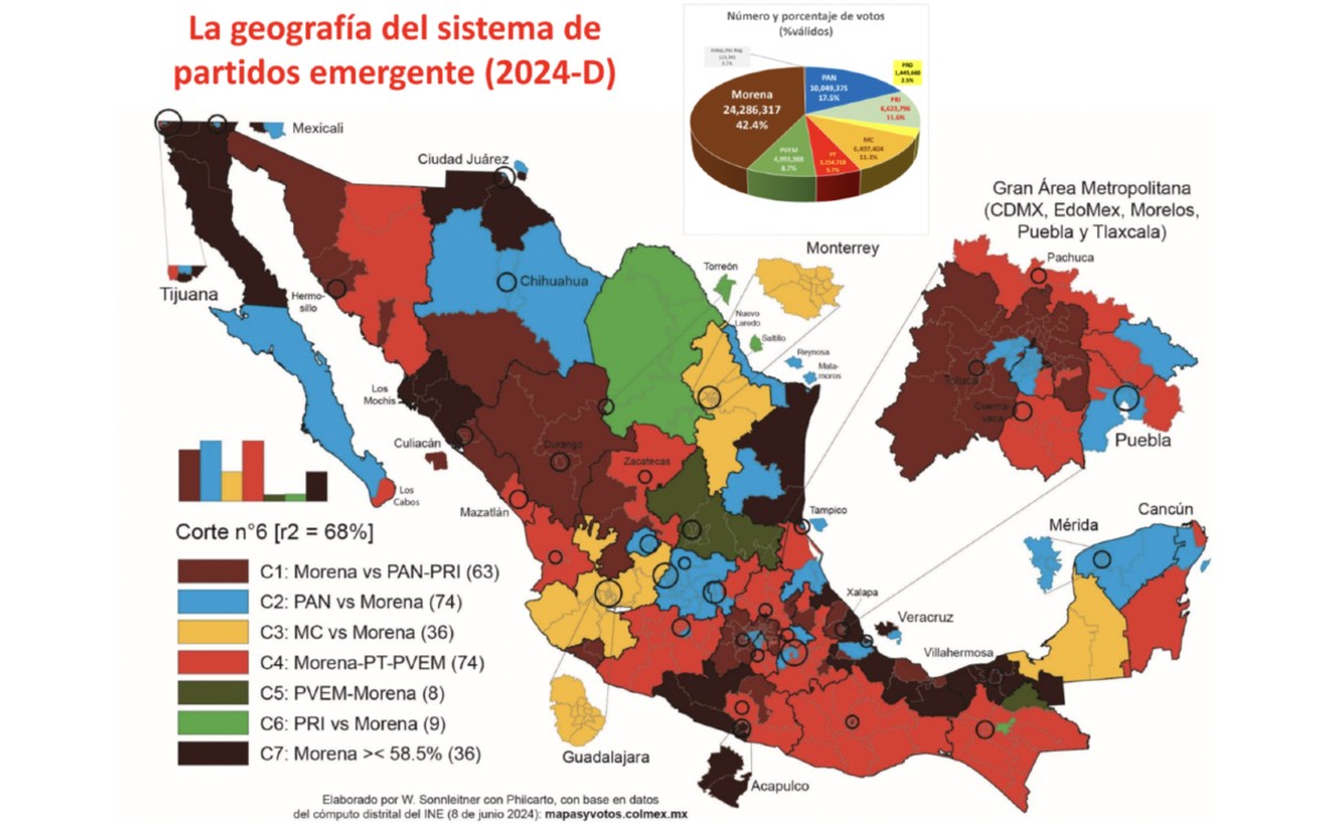 El Dr. Willibald Sonnleitner, Profesor-Investigador del Centro de Estudios Sociológicos de El Colegio de México, explicó en Aristegui En Vivo que tras las elecciones del 2 de junio, México tiene una nueva geografía electoral, dividida principalmente entre dos coaliciones y Movimiento Ciudadano. Esto crea un mapa que agrupa distritos por regiones y muestra el emergente sistema de partidos con seis fuerzas representativas.