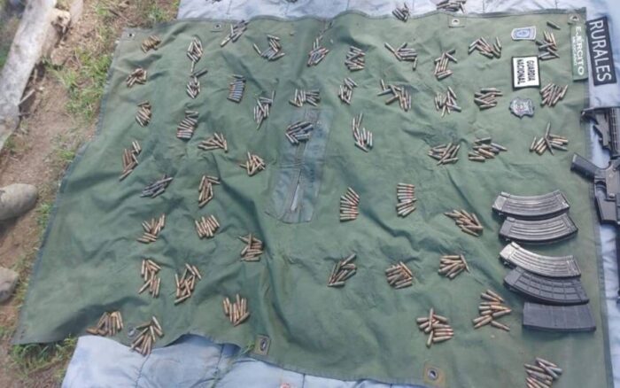 Le fueron aseguradas dos armas, una AK47, conocida como cuerno de Chivo, marca Lancaster, calibre 7.62×39, sin serie y un fusil calibre .223; además de 7 cargadores y 185 cartuchos útiles para la AK47; un cargador y 25 cartuchos para el fusil .223.