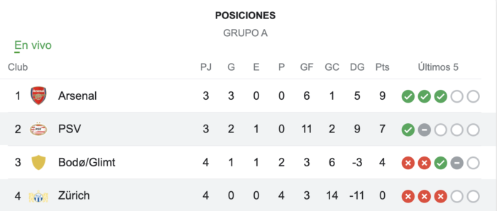 Con este resultado, PSV Eindhoven llegó a 7 puntos en el segundo lugar del Grupo A, encabezado por Arsenal con 9 unidades.