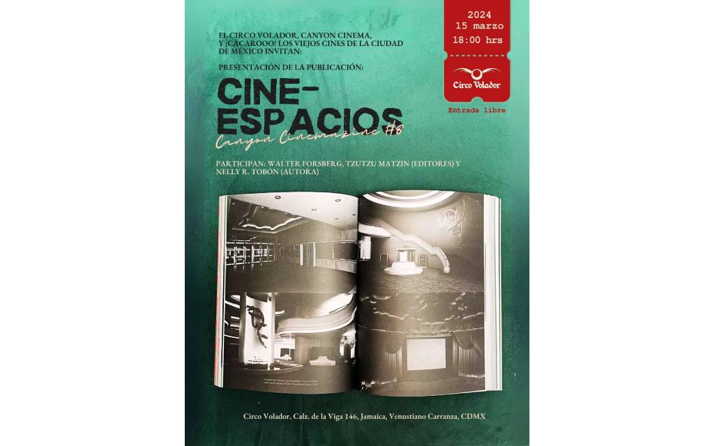 Cine-Espacios es el último número bilingüe de Canyon Cinemazine en el que se recopila memorabilia cinematográfica y material efímero, reimpresiones recientemente traducidas de textos históricos previamente enterrados sobre la construcción de algunas salas cinematográficas ahora inexistentes y una docena de nuevos testimonios en primera persona sobre la cultura cinematográfica actual en el centro del país.