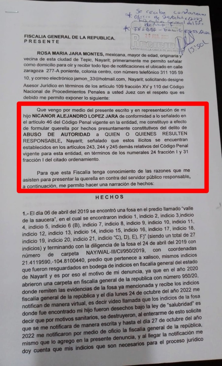 Hace unas semanas, el 20 de febrero de 2023, interpuso una querella ante la FGR por la destrucción de las prendas de su hijo y por abuso de autoridad. Al día siguiente, esta institución remitió la demanda a la fiscalía del estado de Nayarit, a la misma autoridad que desapareció las ropas y que ha negado la participación de policías.