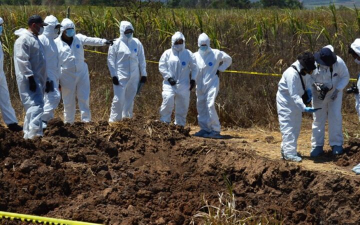 Durante nueve días –del 15 al 24 de abril– peritos enfundados en trajes tyvek, entraron en la tierra para ir extrayendo cada indicio, cada esqueleto, cada hueso de las 21 personas apiladas por sus perpetradores, una sobre otra, dispuestas en hileras separadas por lonas. En 2018, el mismo grupo había encontrado a dos personas en el mismo predio pero la búsqueda se detuvo cuando la fiscalía de Nayarit dijo que era una fosa séptica.