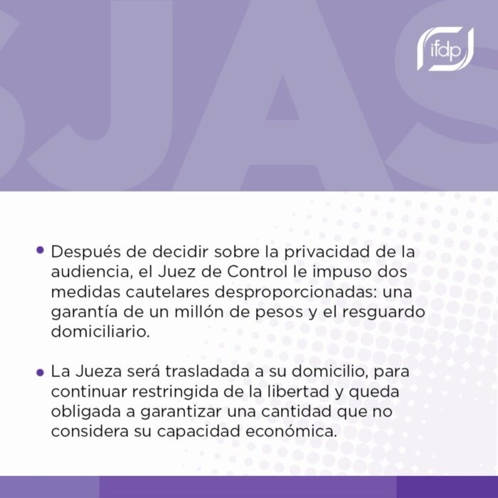 “En dicha sesión, de forma unánime, el Tribunal Colegiado determinó fundada la solicitud de que la suspensión tuviera efectos restitutorios, por desproporcionada. A partir de esta resolución, se tendrá que dictar una nueva medida cautelar a la jueza Angélica Sánchez Hernández, lo que le permitirá continuar su proceso en libertad”, señaló el IFDP en un comunicado.