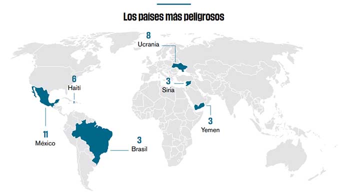 El reporte de RSF menciona que aproximadamente seis de cada diez periodistas (el 64,9%) han perdido la vida en países considerados en paz, de los que México es el más peligroso.