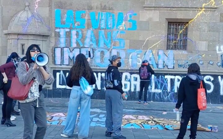 El grupo colocó sobre los muros del edificio sede de las oficinas de la Presidencia de la República los mensajes “las vidas trans importan”, “México transfóbico” y “Ley integral trans”.