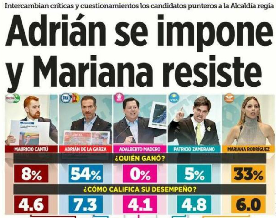 En la evaluación del periódico, se destacó que De la Garza mostró experiencia, mientras que Mariana Rodríguez resistió los embates y tuvo oportunidad de poner en aprietos a su contrincante con señalamientos de corrupción.