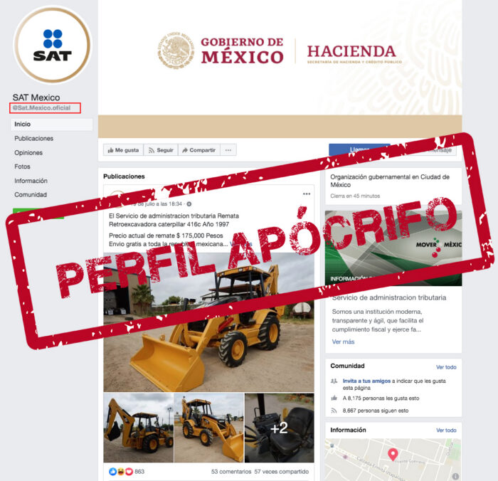 Entre las cuentas detectadas se encuentran, Secretaria de Hacienda y Credito Publico SAT, perfiles con identificadores numéricos en Facebook, así como páginas denominadas Consultores Ceoworks, Aduanas SAT Ventas, Remates Administrativos Tributarios.