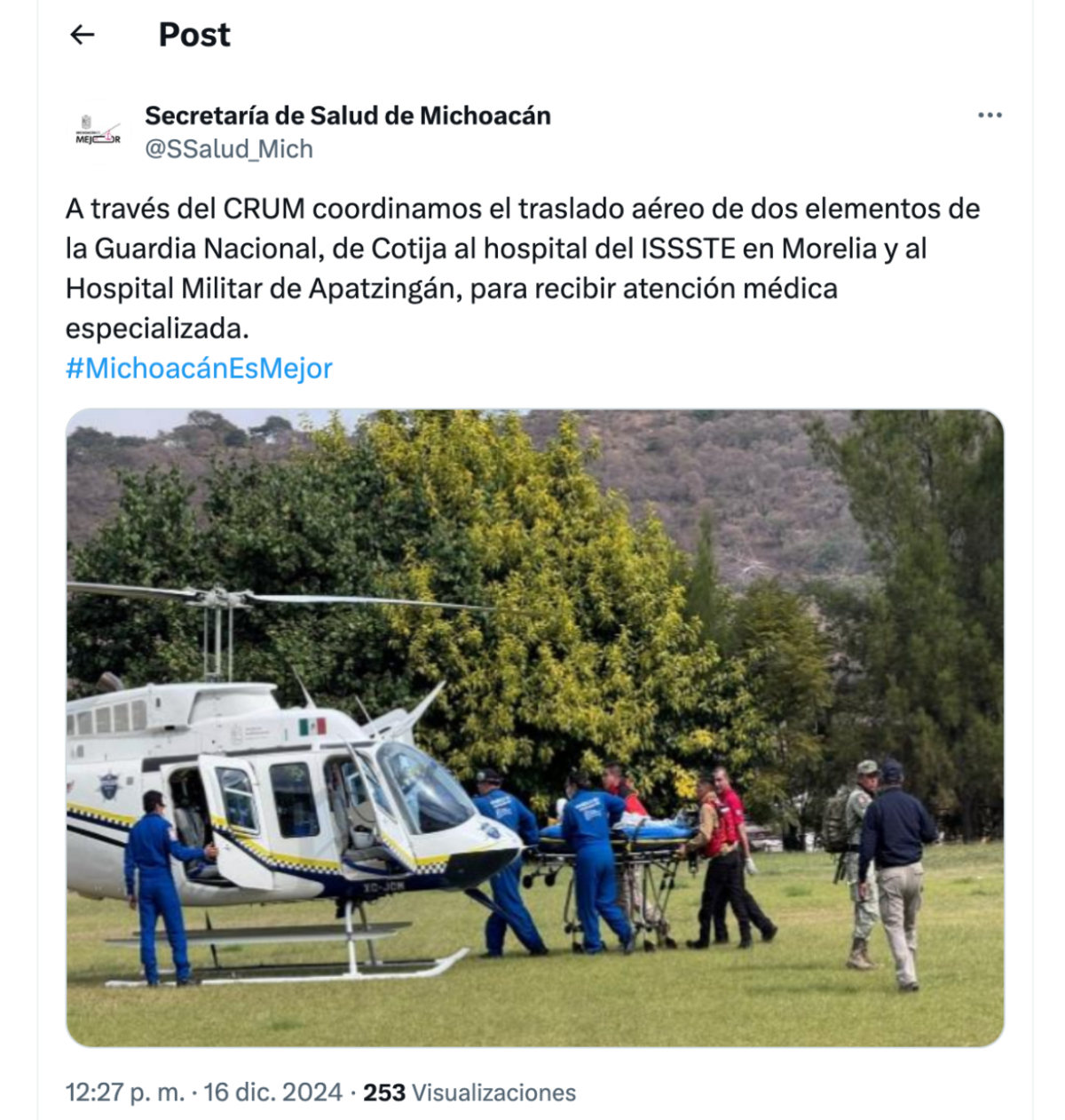 Debido a la gravedad de sus heridas, dos militares tuvieron que ser trasladados a un hospital del ISSSTE en Morelia y al Hospital Militar de Apatzingán.
