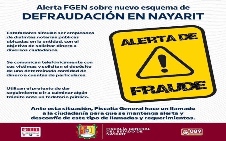 La Fiscalía General del Estado de Nayarit informó que fue detectado un nuevo esquema de defraudación, en el que presuntos delincuentes se hacen pasar por trabajadores de notarías públicas locales para estafar a sus usuarios.