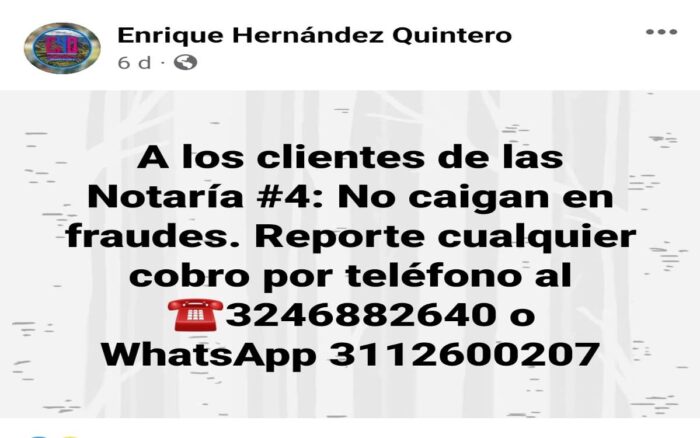 “A los clientes de las Notaría #4: No caigan en fraudes. Reporte cualquier cobro por teléfono al 3246882640 o WhatsApp 3112600207”.