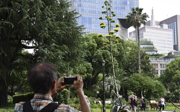 Una planta centenaria de agave, que se dice que florece solo una vez cada siglo, ha comenzado a abrir sus flores amarillas en el céntrico parque tokiota de Hibiya, donde ha atraído a numerosos japoneses y turistas.