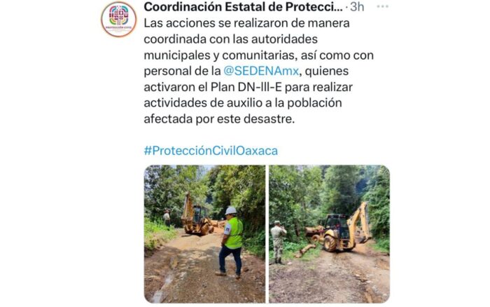 Ante las afectaciones que dejó la onda tropical número 22 en Oaxaca, el Ejército mexicano aplicó el Plan DN-III en las comunidades de Santiago Atitlán, informó la Coordinación Estatal de Protección Civil estatal (Cepco).