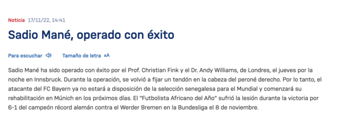 🚨 ÚLTIMA HORA: Sadio Mané se queda fuera de #Qatar2022