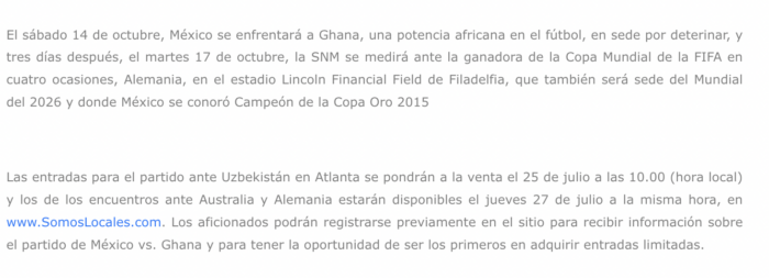 El Tricolor, actual lugar 14 de la clasificación de FIFA, dirigido de manera interina por Jaime Lozano, jugará con Australia, 27 del ranking, el 9 de septiembre en el AT&T Stadium de Arlington, Texas; tres días después, en Atlanta, enfrentará por primera vez en su historia a Uzbekistán, 74 del mundo.