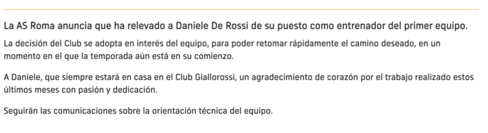 El despido de De Rossi, que ha dirigido 30 partidos a la Roma desde su llegada en enero de este mismo año, llega tras haberse disputado cuatro jornadas de Serie A, en las que el equipo romano solo ha podido sumar tres puntos de 12 posibles, situándose en el lugar 16 en la clasificación a un punto de los puestos de descenso.
