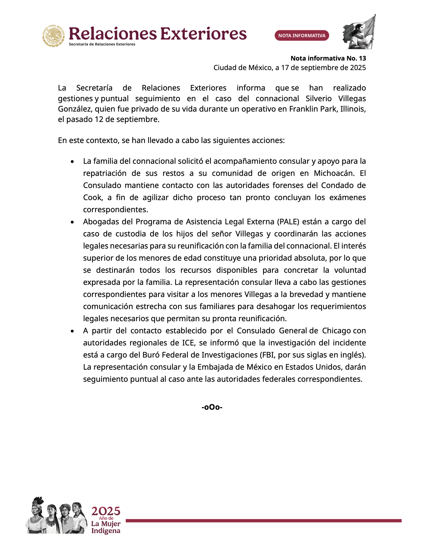 En un comunicado, la cancillería mexicana detalló que entre las acciones emprendidas, el consulado de México en Chicago mantiene contacto con las autoridades forenses del condado de Cook, “a fin de agilizar” la repatriación de sus restos a su comunidad de origen en Michoacán, tal como solicitaron sus familiares.
