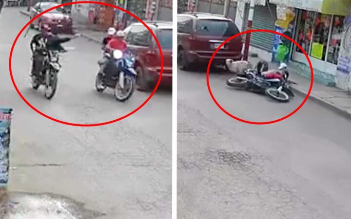 Una cámara de seguridad captó el momento en el que dos personas que viajaban en una motocicleta en la alcaldía Tláhuac, de la Ciudad de México, fueron baleadas por dos sujetos que circulaban a bordo de otra motocicleta.