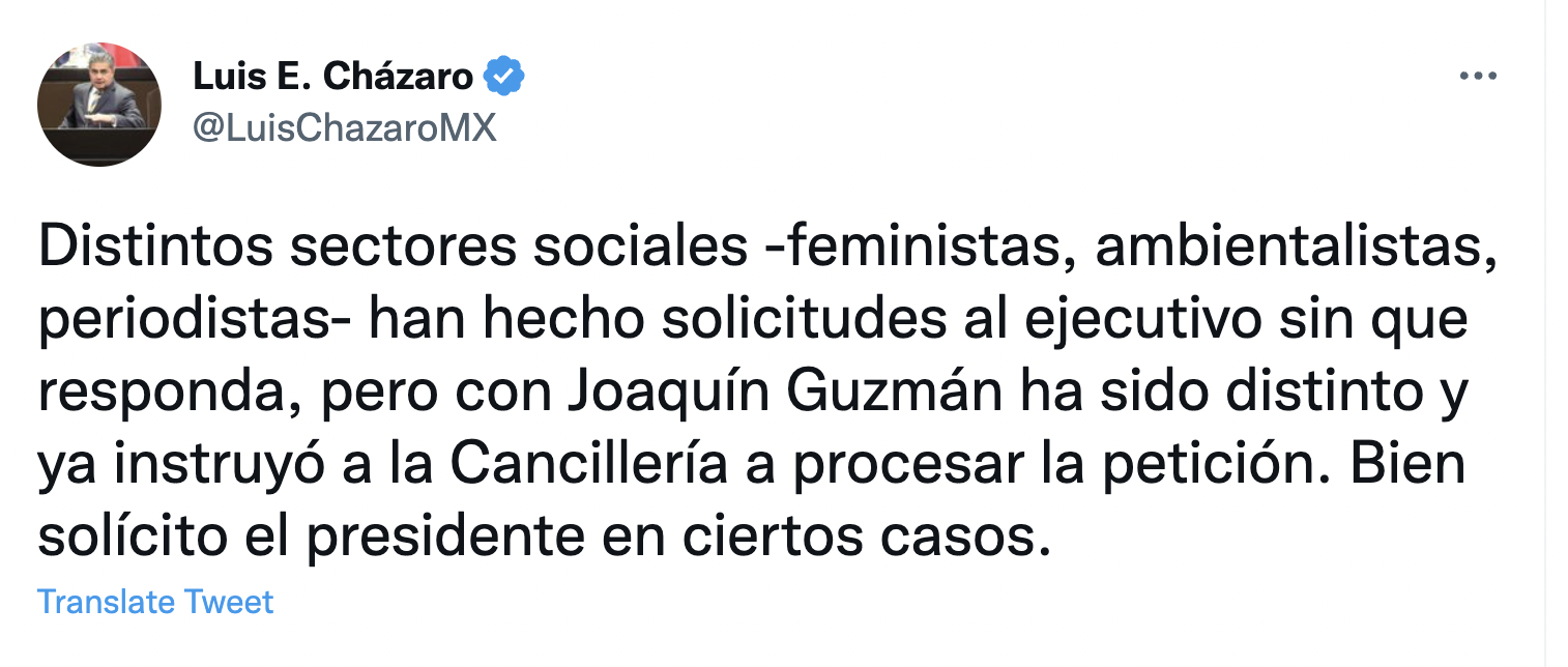 “Distintos sectores sociales -feministas, ambientalistas, periodistas- han hecho solicitudes al Ejecutivo sin que responda, pero con Joaquín Guzmán ha sido distinto y ya instruyó a la Cancillería a procesar la petición. Bien solícito el presidente en ciertos casos”, indicó en redes Luis E. Cházaro, líder del PRD en la Cámara de Diputados.
