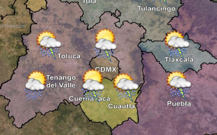 Para este jueves, viernes y sábado se prevén lluvias puntuales extraordinarias en Hidalgo y Puebla, lluvias puntuales intensas en Querétaro, lluvias puntuales muy fuertes en Tlaxcala, lluvias fuertes en Estado de México, así como intervalos de chubascos en Morelos y en la Ciudad de México.