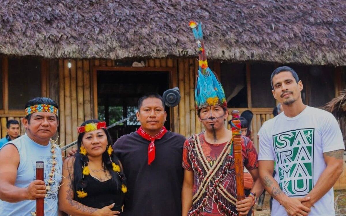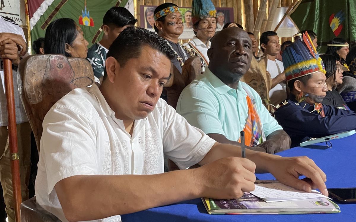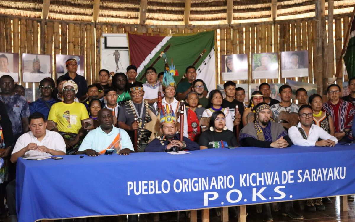 A ellos se unieron representantes de los pueblos indígenas ecuatorianos A’i Kofán de Sinangoe, Waorani y Kichwa de Santa Clara. Juntos navegaron por el río Bobonaza para llegar al Pueblo del Medio Día, como también es conocido Sarayaku. Se reunieron en la Casa del Medio, un espacio asambleario construido de manera tradicional, con bambú en la estructura y hojas tejidas en el techo, y ubicada en el centro comunitario, donde otras construcciones tradicionales rodean una cancha de tierra.