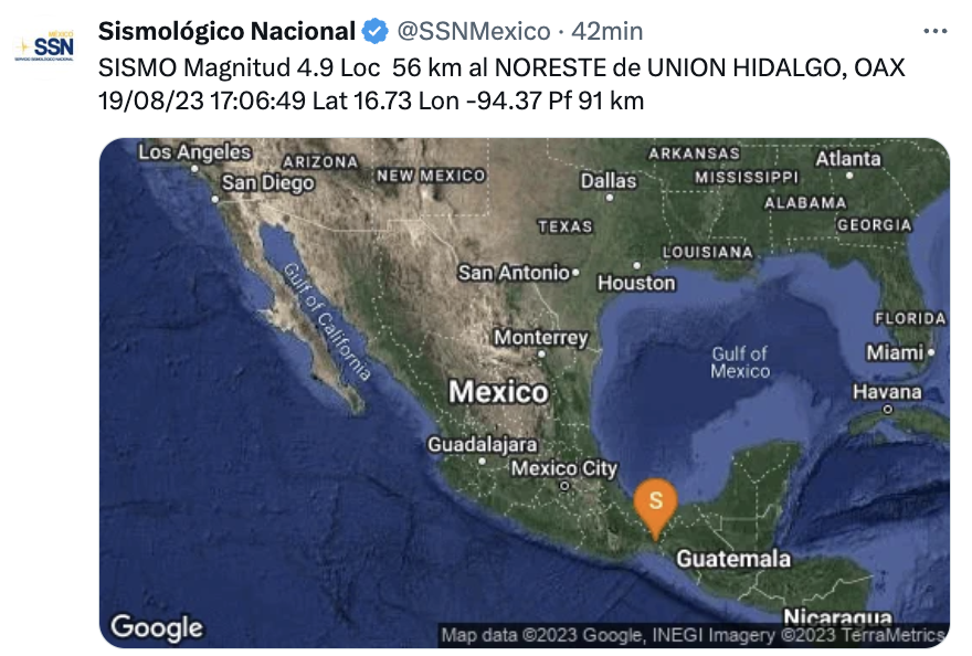Mientras que el sismo registrado en Oaxaca tuvo su epicentro en Unión Hidalgo a las 17:06 con una intensidad de 4.9.