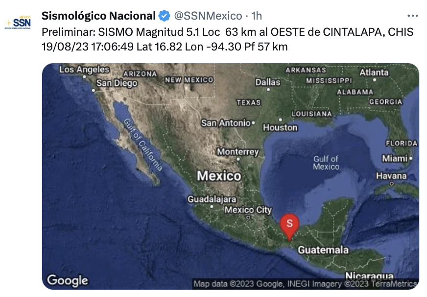 El organismo detalló que el epicentro del temblor en Chiapas se registró al oeste de Cintalapa a las 17:06 horas y su magnitud fue de 5.1.