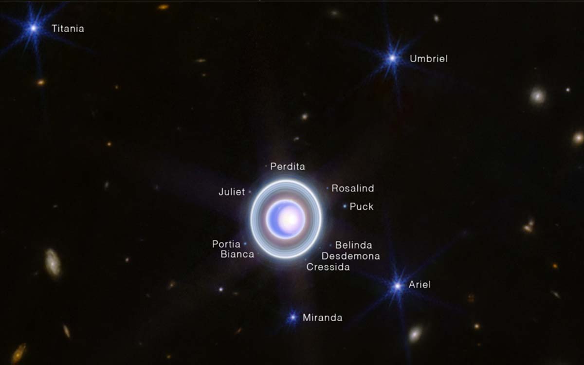 El telescopio ha capturado los tenues anillos internos y externos de Urano, incluido el esquivo anillo Zeta, extremadamente débil y difuso, el más cercano al planeta. También capturó imágenes de muchas de las 27 lunas conocidas del planeta, incluso algunas lunas pequeñas dentro de los anillos.