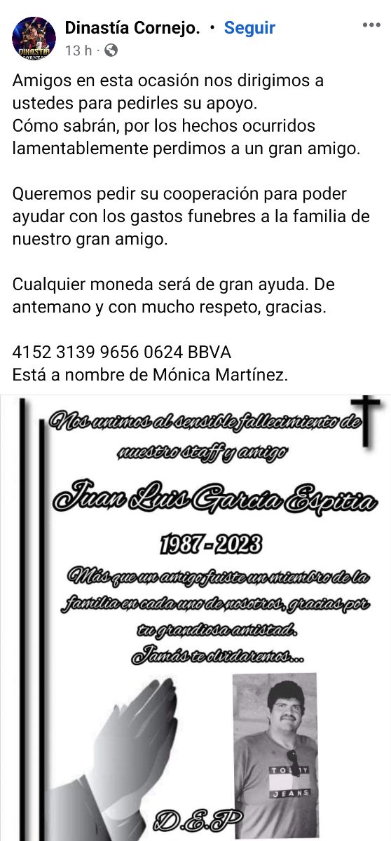 Además, uno de los colaboradores del staff de la banda, Juan Luis García Espitia, de 36 años de edad, también perdió la vida a causa del ataque y por medio de redes sociales, solicitan apoyo económico para que su familia pueda realizar los funerales.