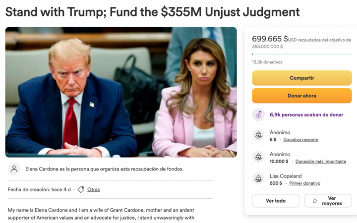 Elena Cardone comenzó la recolección con el título ‘Stand with Trump; Fund the $355M Unjust Judgment’ (‘Apoye a Trump; Financia la sentencia injusta de 355 millones de dólares’) luego que un juez lo sentenciara a pagar esa suma en un juicio civil en Nueva York.