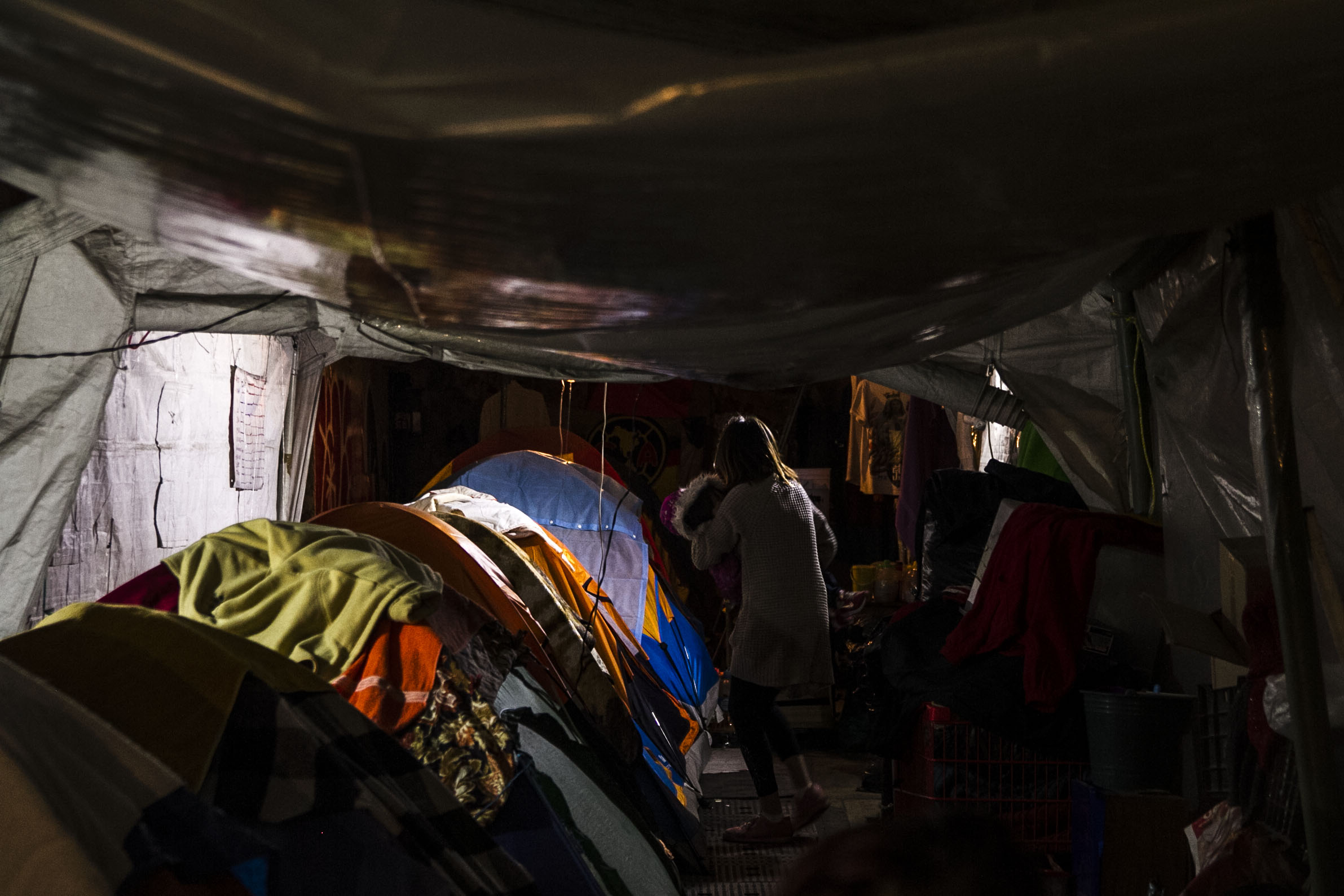Una madre acuesta a su hijo en la Navidad de 2017. Vecinas montaron un campamento después de ser desalojadas en Cuauhtémoc 166, colonia Centro. Fotografía: Ernesto Álvarez y Eliana Gilet