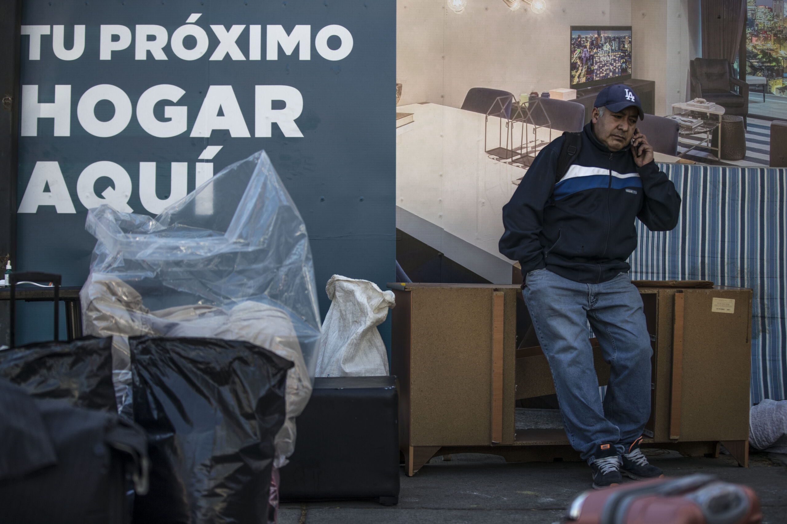 Un hombre recién desalojado habla por teléfono frente a una publicidad inmobiliaria el 11 de marzo de 2022. El desalojo de Insurgentes 96 dejó a 50 familias en la calle. Fotografía: Ernesto Álvarez y Eliana Gilet