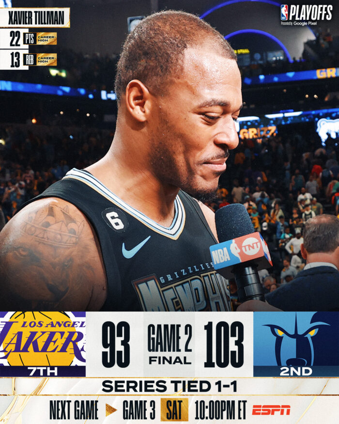 Los Grizzlies de Memphis vencieron, 103-93, a los Lakers de Los Angeles e igualaron la serie 1-1; Xavier Tillman brilló con un doble-doble de 22 puntos y 13 rebotes.